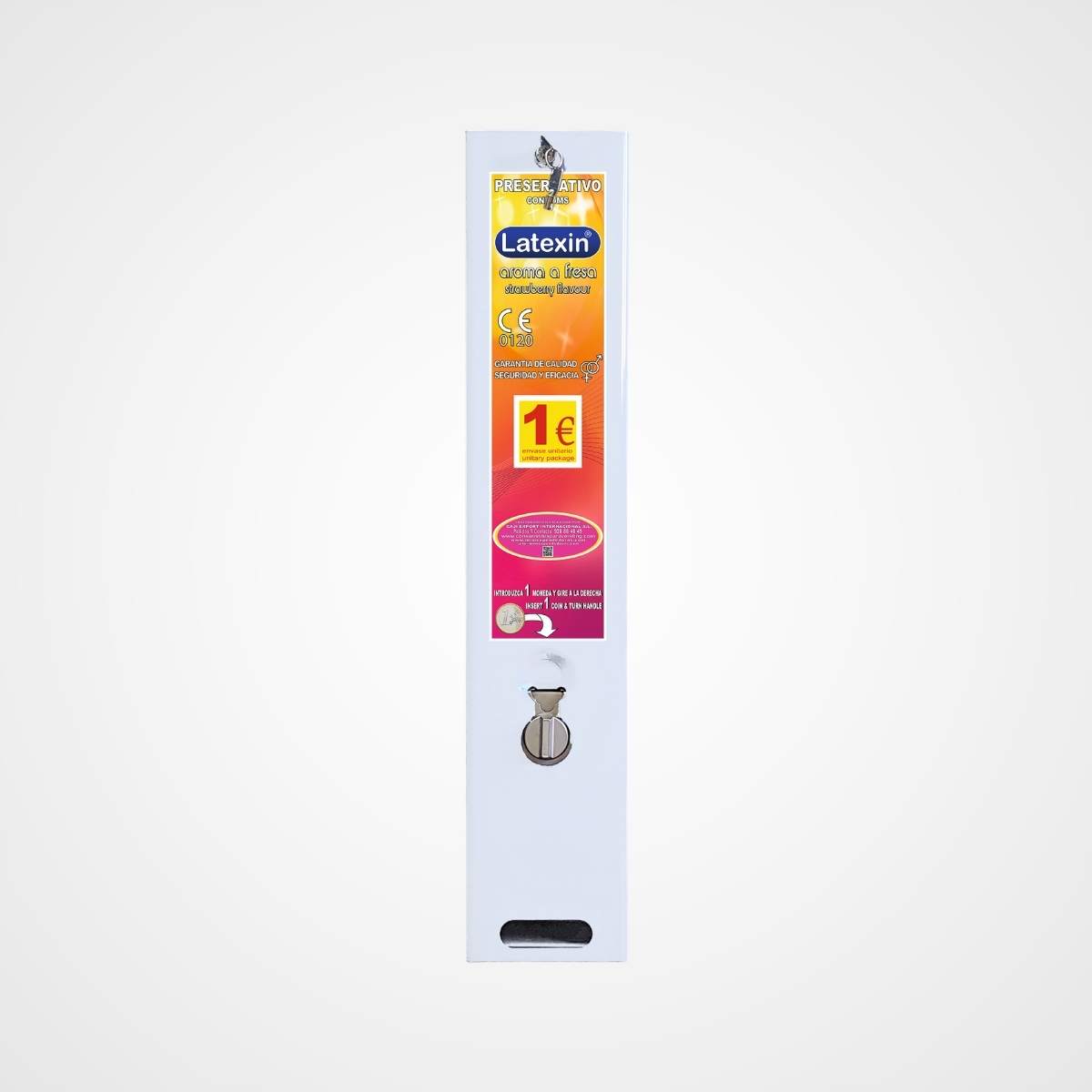 Máquina expendedora de un canal para preservativos en estuche unitario.